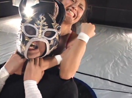 セクシーなリングコスチュームを身にまとったスーパーソニックサテライツのキャットファイター2人が男子レスラー相手に得意の関節技を極め絞め上げます。